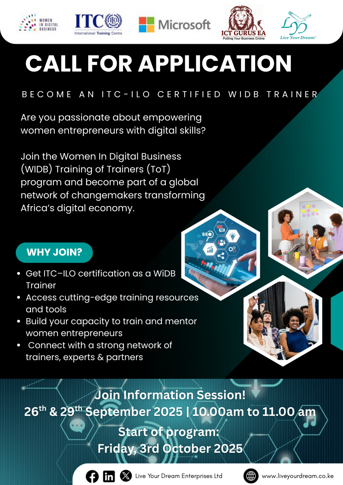 Are you ready to make an impact in Africaβs digital economy? The Women in Digital Business (WiDB) Training of Trainers (ToT) equips you with internationally recognized certification, access to a powerful Learning Management System (LMS), global partnerships, new revenue streams, and so much more. π